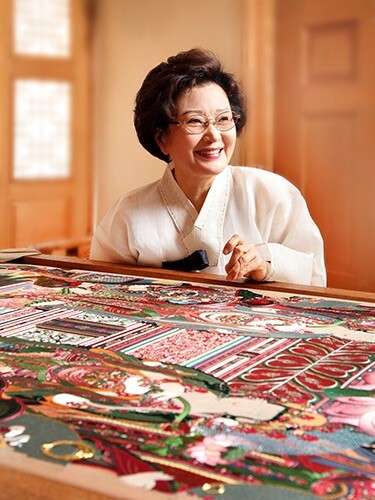 국가무형유산 최유현(91·사진) 자수장 보유자가 자신의 작품과 소장품을 한국전통문화대학교에 기증했다. 23일 전통대는 전날 최 보유자로부터 직접 제작한 자수 작품 124건과 도자기·민속품 등 소장 유물 1185건을 기증받았다고 밝혔다.