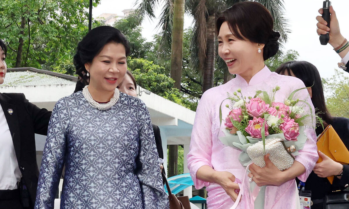 김 여사는 이날 오전 하노이 민족학박물관을 방문, 리 여사와 함께 전시와 수상 인형극을 관람하며 차담을 나눴다. 김 여사가 전날 리 여사로부터 선물 받은 분홍색 아오자이를 입고 박물관에 도착하자 리 여사는 “너무 예쁘시다. 베트남 소녀 같다”고 칭찬했고, 김 여사는 “감사하다”고 화답했다.