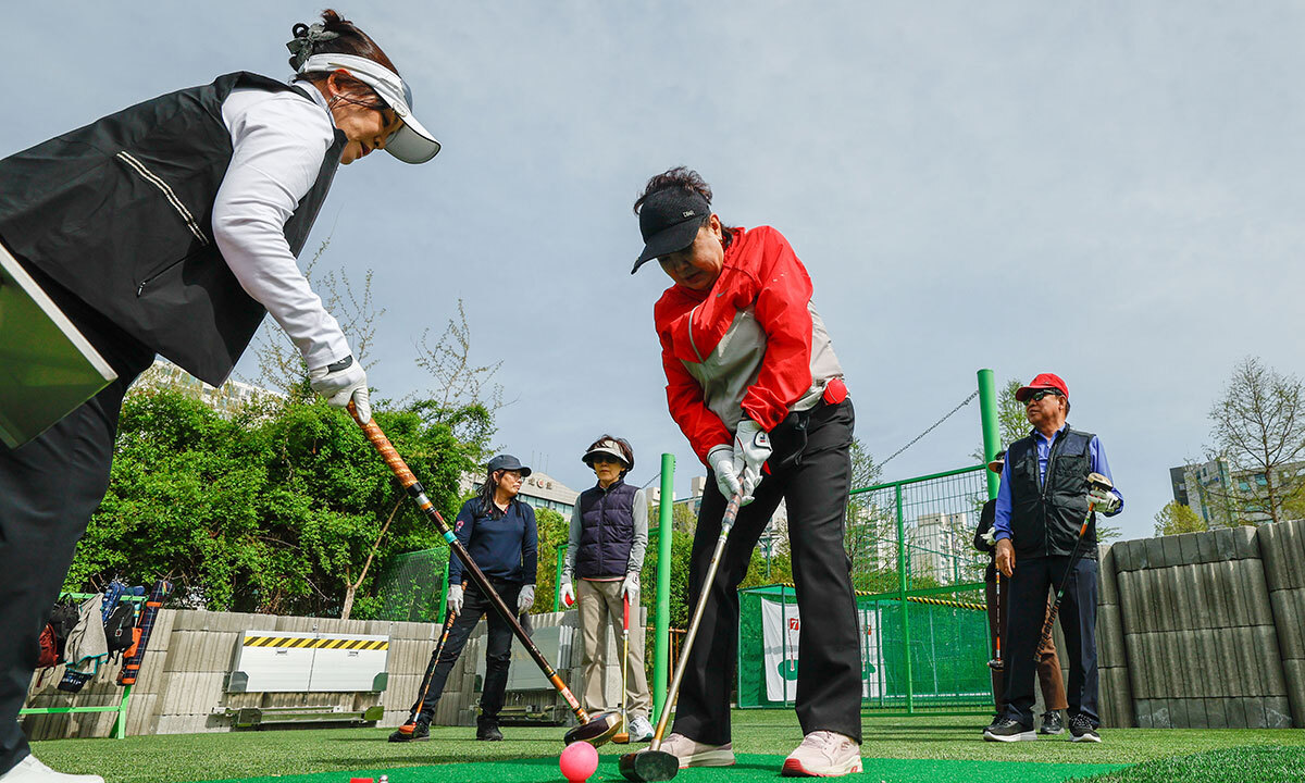 23일 서울 송파구 성내유수지 파크골프장에서 강동구청 파크교실이 열린 가운데 시민들이 파크골프를 배우고 있다. 강동구는 이달 한 달간 60세 이상 강동구민을 대상으로 실내 스크린파크골프장에서 이론 및 안전교육, 현장 필드에서 라운딩 실습을 진행한다.