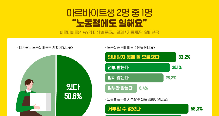 아르바이트생 절반가량이 노동절에도 근무하는 가운데, 수당을 받는 비율은 40%에도 못 미치는 것으로 나타났다.