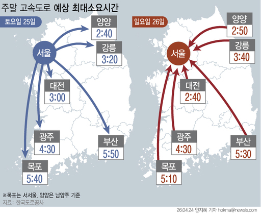 25일 토요일은 전국적으로 포근한 봄 날씨가 이어지면서 교통량이 지난주보다 소폭 증가할 것으로 전망된다.