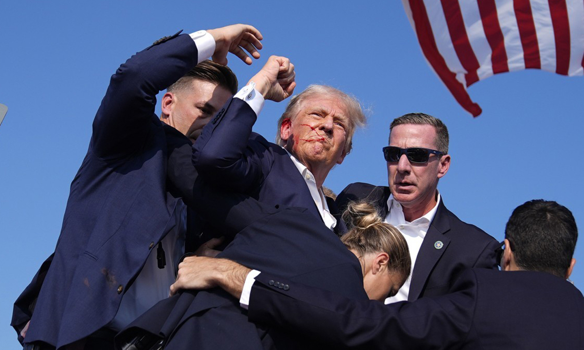 귀와 얼굴에 피가 묻은 트럼프 당시 후보가 경호원들에게 둘러싸인 채 대피하면서도 주먹을 불끈 쥐어 치켜올리는 장면이 전 세계에 타전됐다.