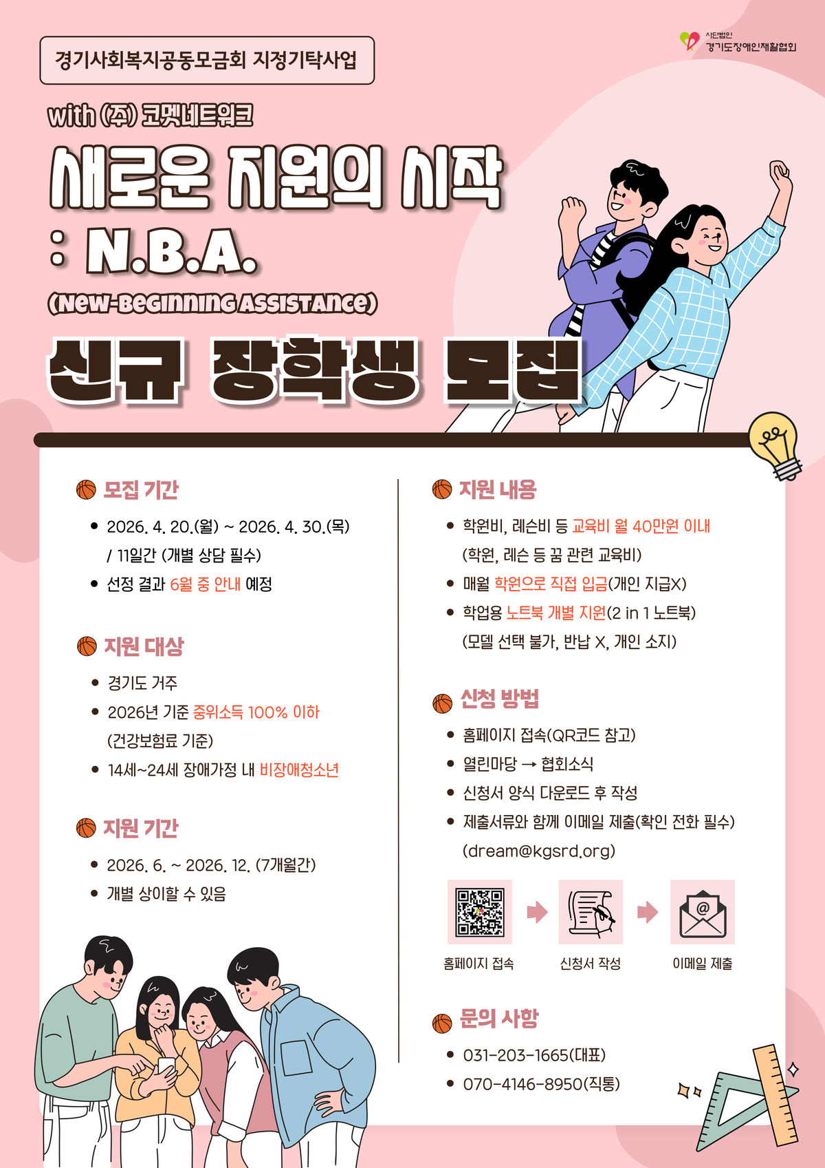 ‘N.B.A.: 새로운 지원의 시작’은 경제적 어려움으로 학업 및 진로 설계에 제약을 겪는 비장애 청소년의 학업 역량 강화와 재능 계발 지원을 목적으로 한 사업이다. 선정된 장학생에게는 매월 교육비와 함께 학습용 노트북이 지원된다.