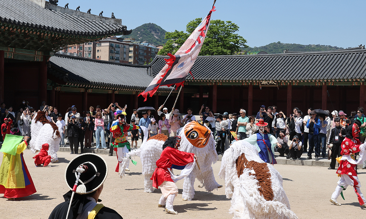 26일 서울 종로구 창덕궁에서 관람객들이 지켜보는 가운데 길놀이 행사가 열리고 있다. 국가유산청 궁능유적본부는 5월 3일까지 서울의 5대궁(경복궁·창덕궁·덕수궁·창경궁·경희궁)과 종묘에서 궁중문화축전을 개최한다.