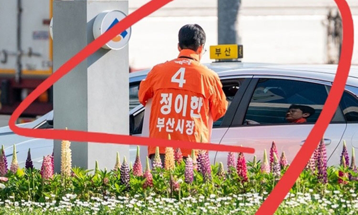 27일 오전 8시 5분께 부산 금정구 구서 나들목 인근 세정타워 앞 도로를 지나가던 한 승용차 운전자가 화단 교통섬에서 선거유세를 하던 개혁신당 정이한 부산시장 후보를 향해 음료수를 뿌렸다.