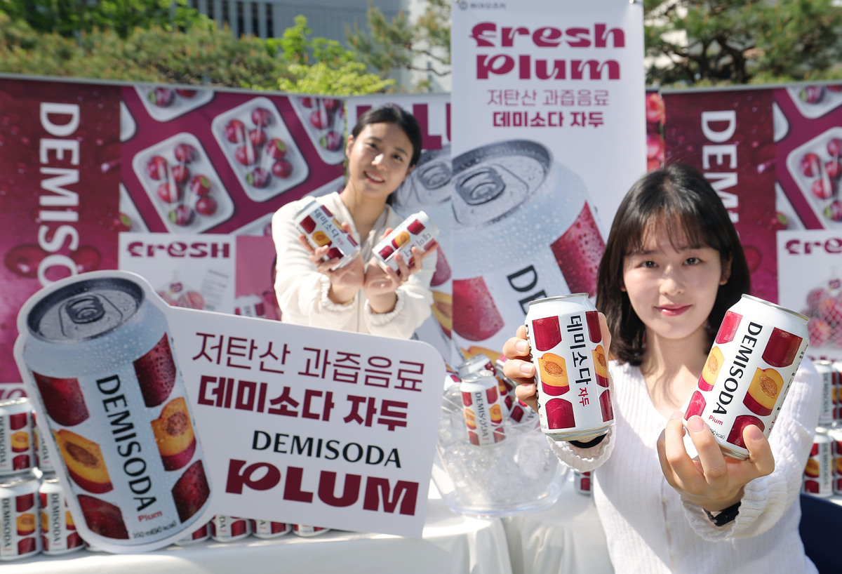 27일 서울 동대문구 동아오츠카 서울사무소에서 열린 과즙 탄산음료 데미소다 자두 출시 행사에서 모델들이 신제품을 소개하고 있다. 과즙 함량 12%의 데미소다 자두는 온라인 판매처와 자판기 등의 유통 채널을 통해 5월 만나볼 수 있다.