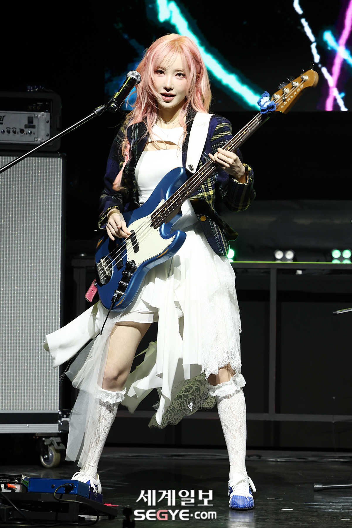 밴드 qwer 마젠타가 27일 서울 마포구 창천돈 예스24 원더로크홀에서 열린 미니 4집 ‘CEREMONY’의 쇼케이스에 참석해 열띤 공연을 펼치고 있다.