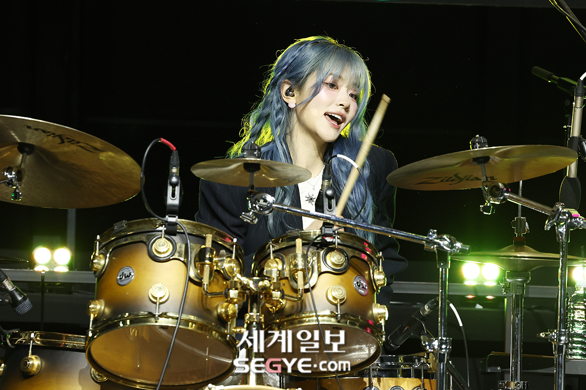 밴드 qwer 쵸단이 27일 서울 마포구 창천돈 예스24 원더로크홀에서 열린 미니 4집 ‘CEREMONY’의 쇼케이스에 참석해 열띤 공연을 펼치고 있다.