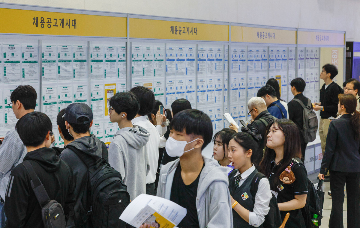27일 서울 강남구 코엑스에서 2026 제1차 KB굿잡 우수기업 취업박람회가 열린 가운데 구직자들이 부스를 둘러보고 있다.