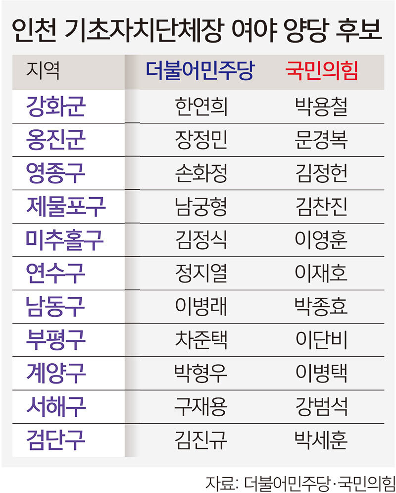 연수구에서는 민주당 정지열 전 연수구의회 의장과 국민의힘 이재호 현 연수구청장이 맞붙는다. 부평구청장을 놓고 3선에 도전하는 민주당 차준택 현 부평구청장과 단수 공천을 신청했던 국민의힘 이단비 인천시의원이 격돌하고, 계양구청장에는 민주당 박형우 전 계양구청장과 국민의힘 이병택 전 인천시당 부위원장이 격돌한다.