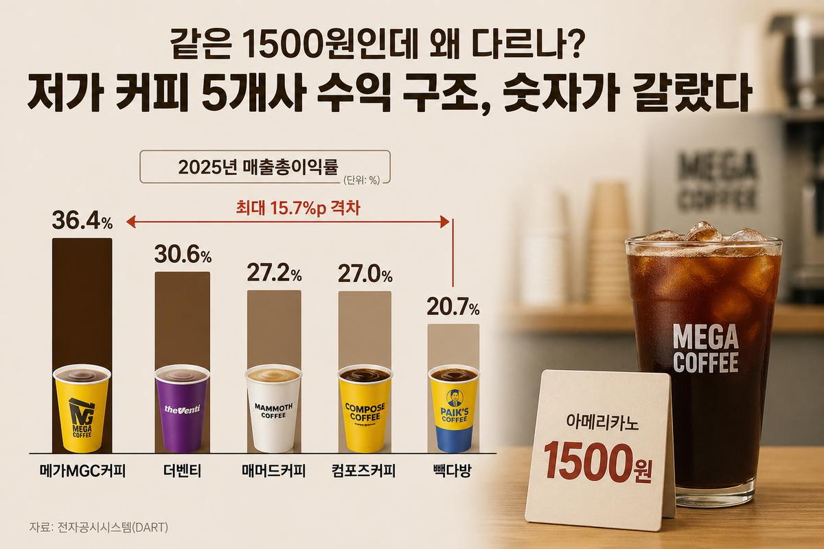 같은 1500원이라도 메가MGC커피는 36.4%, 빽다방은 20.7%. 겉으로 보이지 않는 격차가 내부에서 벌어지고 있었다.