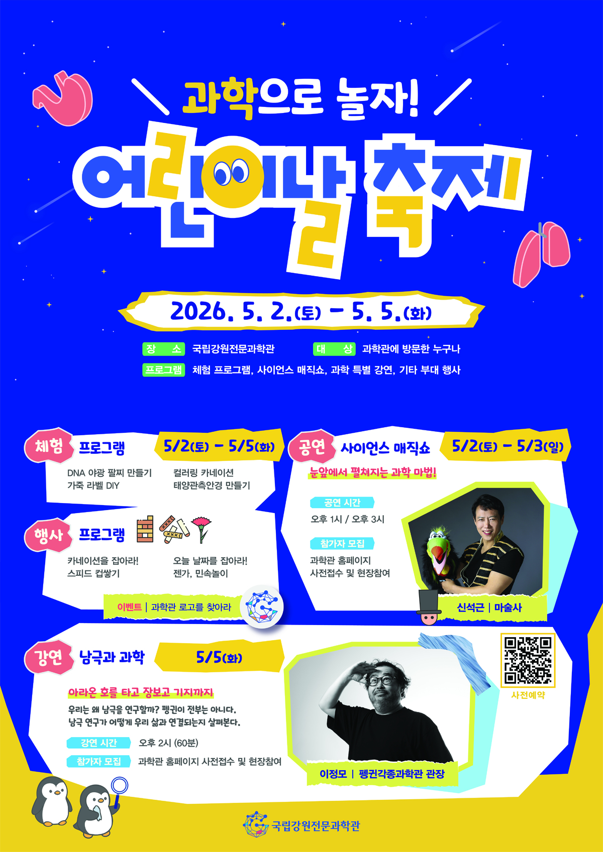 어린이날 오후 2시에는 과학커뮤니케이터 이정모 관장 초청 특별 강연이 열린다. 방송과 저술 활동으로 잘 알려진 이 관장은 이번 강연에서 ‘남극과 과학’을 주제로 극지 연구와 과학 이야기를 어린이의 눈높이에 맞춰 쉽고 흥미롭게 풀어낼 예정이다. 사전 참가 접수 학생에게는 저자 사인이 담긴 도서가 선착순 배부될 예정이다.