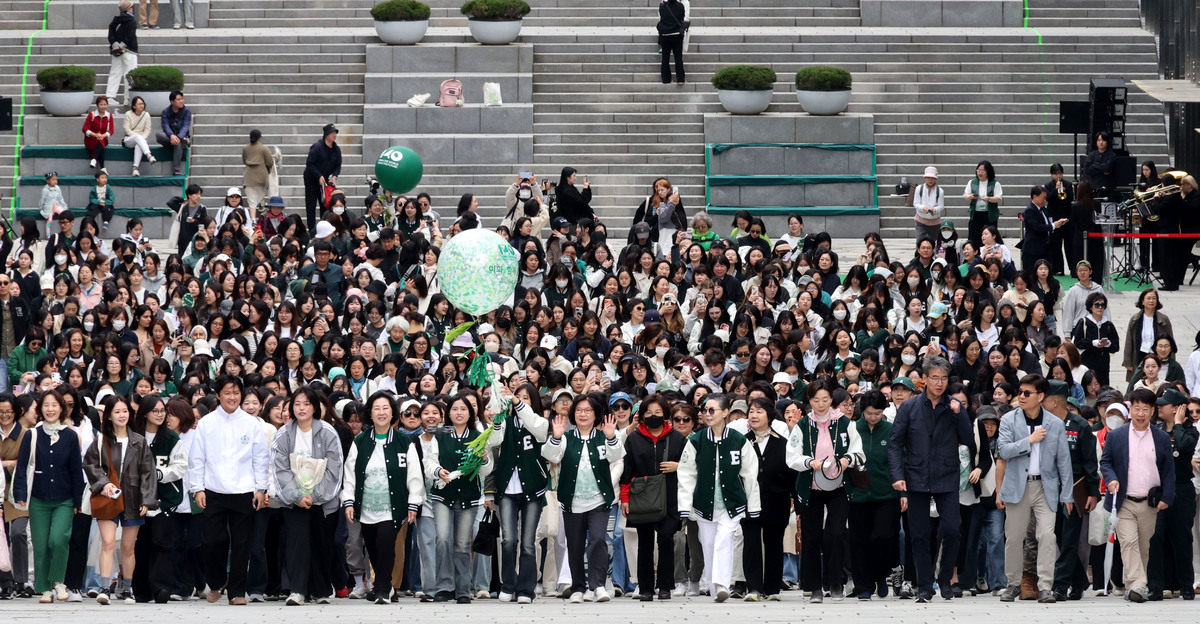 28일 서울 서대문구 이화여자대학교에서 창립 140주년 기념 ‘이화, 함께 걷다’ 행사가 진행되고 있다. 이번 야외 걷기 행사에는 이화여대 학생·교수·직원과 동창을 비롯해 지역주민 등 약 1400명이 참가했다. 참가자들은 이화여대 캠퍼스와 이화학당 설립자 메리 스크랜튼(Mary F. Scranton) 선교사의 헌신과 공헌을 기리기 위해 지정된 정문 앞 스크랜튼길을 함께 걸었다. 걷기 코스는 ECC 계단에서 시작해 정문-대현문화공원-대강당-본관 앞을 거쳐 다시 돌아오는 약 1.4㎞이다.