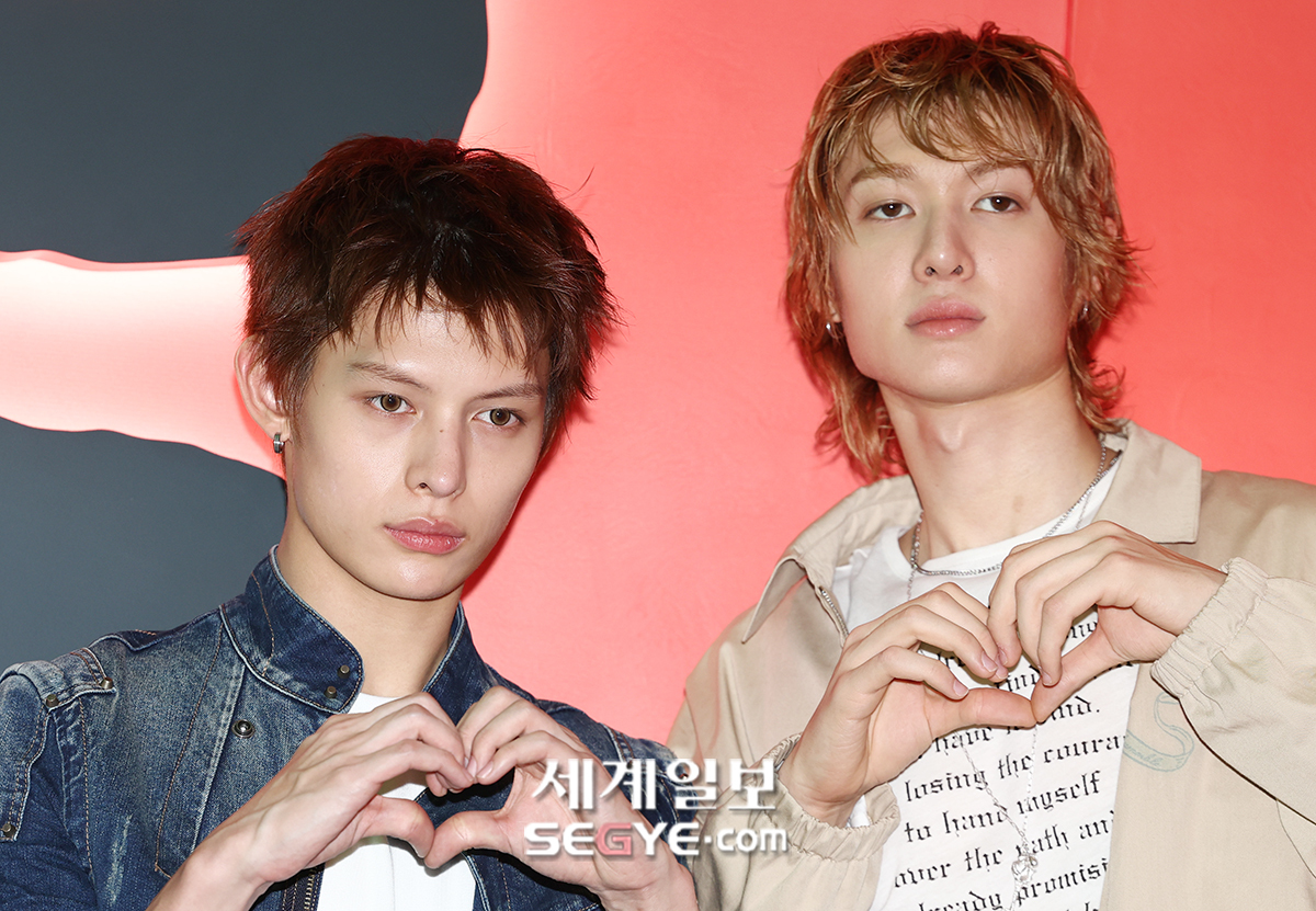 그룹 코르티스 제임스(사진 왼쪽)와 마틴이 28일 오후 서울 성동구 성수동 한 매장에서 진행된 글로벌 숙박 체험 플랫폼 체험 론칭 기념 행사에 참석해 포즈를 취하고 있다.