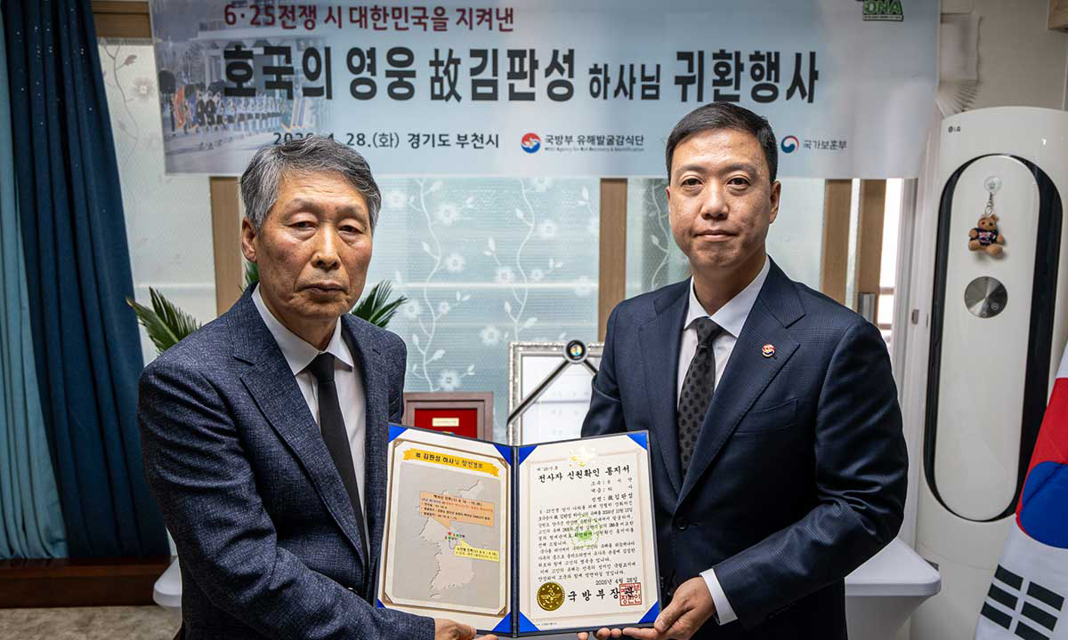 국방부 유해발굴감식단은 6·25전쟁 당시 중동부 전선 격전지인 ‘백석산 전투’에서 전사한 고(故) 김판성 하사(현 계급 상병)의 유해를 발굴해 신원을 확인했다고 28일 밝혔다. 1929년생인 고인은 1951년 5월 제주도 제1훈련소로 입대한 뒤 국군 제8사단 10연대에 배치됐다. 휴전회담 우위 선점과 군사분계선 확정 시 유리한 지형 확보를 위해 강원 양구군 북방의 전략적 요충지 백석산 일대에서 벌어진 전투에서 목숨을 잃었다. 고인의 유해는 2024년 10월 발굴됐고, 유전자 시료 분석을 거쳐 올해 1월 신원이 확인됐다. 감식단은 이날 고인의 조카인 김창선씨의 자택에서 ‘호국의 영웅 귀환 행사’(사진)를 열었다.