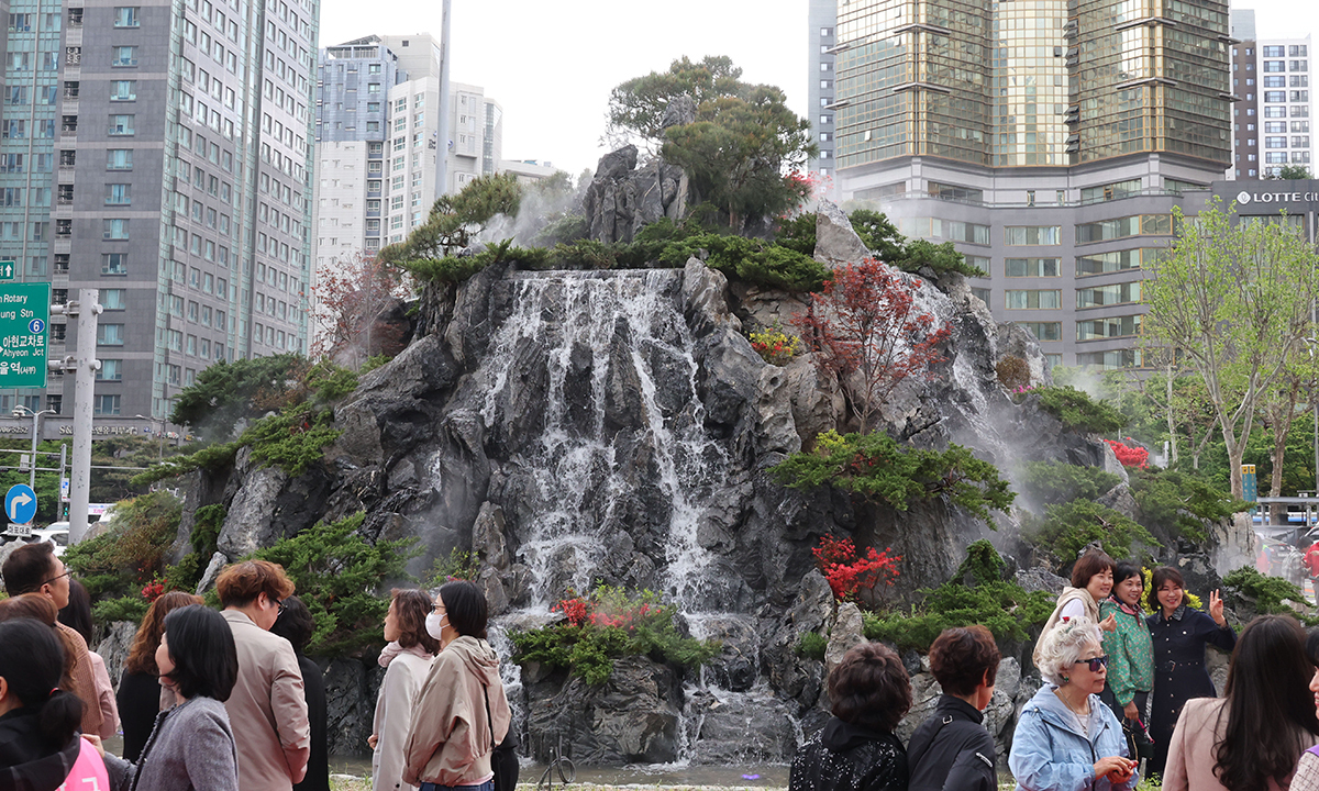 28일 서울 마포구 공덕오거리 교통섬 인공 폭포가 준공식을 갖고 가동되고 있다. 구가 조성한 이 인공 폭포는 높이 7m, 폭 16m 규모로 15개의 물줄기가 흘러 어느 방향에서도 조망이 가능하다.