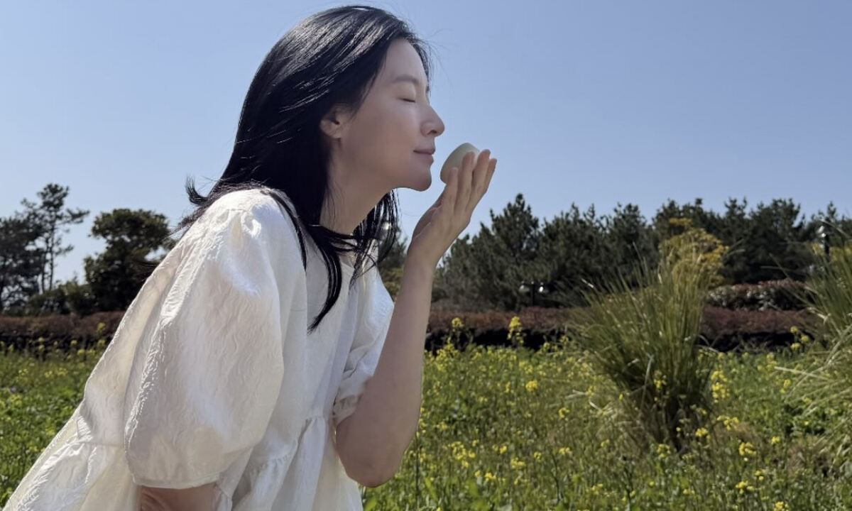그는 흰색 블라우스를 입은 채 눈을 감고 자연을 만끽하는 듯한 표정을 짓고 있어 편안한 분위기를 자아냈다. 화려한 장신구 없이도 깨끗한 피부와 또렷한 이목구비가 드러나며 자연스러운 아름다움을 강조했다.