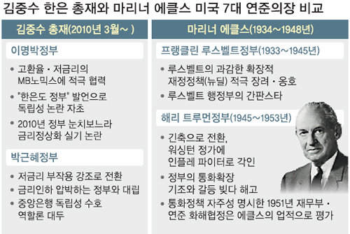 | 韓銀, 김중수도 에클스처럼… 정부에 맞서 중앙銀 독립 다져 입력 2013-04-08 18:14:22, 수정 2013-04-09 14:19:02 과거 미국 연방준비제도이사회(FRB) 사무실은 재무부 청사에 있었다. 중앙은행이 정부 품안에 있었던 셈이다. 멋진 대리석 건물을 지어 독립한 것은 프랭클린 루스벨트 대통령 시절인 1937년이다. 당시 FRB 의장이 마리너 에클스(7대·1934∼48년)이다. 그래서 건물이름도 ‘에클스 빌딩’이다. 그는 중앙은행 독립성의 기반을 다진 인물로 평가된다. ‘골리앗 행정부와 싸움을 마다하지 않는 글래디에이터’라는 수사가 따라붙었다.