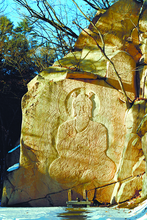 | | 돌계단 위에 자리한 거대한 마애불. | 묘적암은 약 1500년의 내력을 지닌 암자로, 나옹화상이 출가한 곳이다. 손바닥만 한 암자는 흙담에 소박한 대문을 달고 있지만, 절로 옷깃을 여미게 할 정도로 묵직한 기운이 감돈다. 암자를 홀로 지키는 동참스님에게 차 한 잔을 얻어 마시고 묘적암 툇마루에 앉자, 맞은편 봉우리의 사불바위가 정면으로 올려다보인다. 툇마루에는 ‘일묵여뢰(一默如雷)’라는 편액이 걸려 있다. 유마경에 나오는 말로 ‘한 번의 침묵이 곧 우뢰와 같다’는 뜻이다. 마음의 평화를 위해 찾은 고요한 산중 암자에 이보다 더 잘 어울리는 말도 없을 듯싶다.