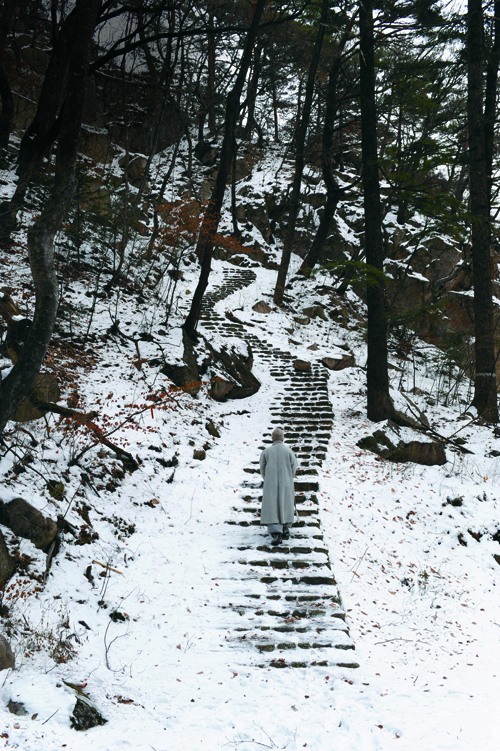| [여행] 선(禪)으로 가는 길… 문경 대승사 묘적암과 윤필암 겨울 풍경 성철·청담 스님 등 현대 불교계 거목들 마음 닦은 곳 입력 2015-01-22 16:40:33, 수정 2015-01-22 18:54:33  | | ' | 한겨울 고즈넉하고 평화스런 정취를 찾는다면 깊은 산속의 암자를 빼놓을 수 없겠다. 아름다운 풍경만 놓고 보면 가을이 낫겠지만, 고요하고 청명한 분위기는 겨울을 따라올 수 없다. 흰 눈에 덮여 정적이 흐르는 암자는 그 안에 드는 것만으로도 마음을 호수처럼 잔잔하게 만들어 주는 묘한 매력이 있다.