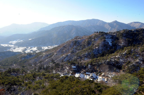 사불바위 옆에 서면 거칠 것 없는 조망이 펼쳐진다. 이곳까지 뻗어있는 소백의 연봉들이 굽이쳐 흐른다. 발아래로는 윤필암 법당들이 가지런히 서 있고, 맞은편 산자락 8부 능선쯤에 손바닥만 한 묘적암이 그림처럼 들어서 있다.