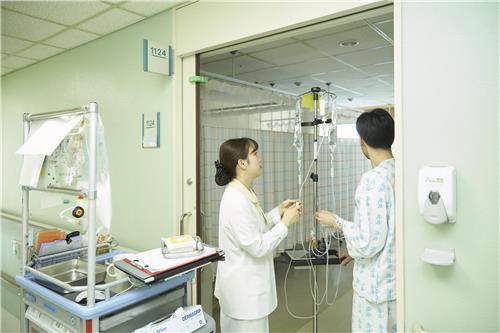 대신 병원이 제공하는 간호인력이 24시간 간호서비스를 제공하는 간호·간병통합서비스 병원이 증가하고 있다. 이 서비스가 정착되면 환자는 감염 우려 없이 치료를 받을 수 있고 환자 보호자들도 생업에 지장없이 일상 생활이 가능하다. 지난해 전국을 공포로 몰아넣은 중동호흡기증후군(메르스) 확산 사태를 겪은 이후 감염에 매우 취약한 것으로 드러난 바 있다. 18일 국민건강보험공단에 따르면 현재 국내에 지정된 간호·간병통합서비스 제공 의료기관은 모두 161곳(1만1천689병상)이다. 의료기관 규모별로는 상급의료기관 8곳(829병상), 종합병원 95곳(7천514병상), 병원 58곳(3천346병상)이다. 이 중 규모가 가장 큰 대학병원 이상 상급의료기관의 경우 지난해까지는 2013년 7월 시범 병원으로 지정된 인천의 인하대병원이 유일했다. 그러나 올해 들어 충북대병원과 길병원에 이어 부산대병원, 동아대병원, 고신대복음병원, 순천향대 부속 부천병원·천안병원이 추가로 참여하는 등 빠르게 확산하는 추세다. 건강보험공단은 보건복지부, 심사평가원, 대한병원협회, 병원간호사회 등의 전문가들로 기구를 구성해 간호·간병통합서비스 제공기관 지정과 간호 인력 배치의 적정성 등을 심의하고 있다. '보호자 없는 병실'은 일반 병실보다 북적대지 않아 쾌적하고 청결한 환경이 유지되는 탓에 환자가 안전한 입원환경에서 치료받을 수 있는 게 최대 장점으로 꼽힌다. 환자 본인의 부담 비용은 1일 입원 기준으로 1만5천∼2만원이다. 환자가 따로 간병인을 채용했을 때 일반적으로 1일 7만원 가량을 내는 것과 비교하면 절반 이하 수준이다. 서비스를 이용하는 환자들의 반응도 대체로 긍정적이다. 간암으로 항암 치료를 받기 위해 인하대병원에 여러 차례 입원한 황모(70)씨는 "정기적으로 입원이 필요한 상황이라 가족 간병에 대한 부담이 컸는데 별도의 간병인을 채용할 때보다 적은 비용으로 간병서비스를 받아 만족스럽다"고 말했다. 간병을 맡은 간호사들은 욕창 방지와 낙상 예방을 비롯한 환자 상황에 맞는 전문간호서비스는 물론 30분 간격으로 병실을 돌고, 보호자에게 환자의 상태를 알리는'보호자 안심서비스'도 제공한다. 이 때문에 맞벌이 부부를 비롯해 가족이 입원했을 때 생업을 중단하고 직접 간병을 할 수 없는 이들에게 특히 환영을 받고 있다. 아킬레스건 파열로 최근 입원한 김모(51·여)씨는 "거동이 불편한 상태에서 세심하게 신경을 써주는 전문간호가 마음에 든다"면서 "가족들도 보호자 침대와 침구, 소지품, 음식물 등으로 지저분한 병실 대신 깔끔하게 정돈된 병실을 보고 안심하고 있다"고 말했다.