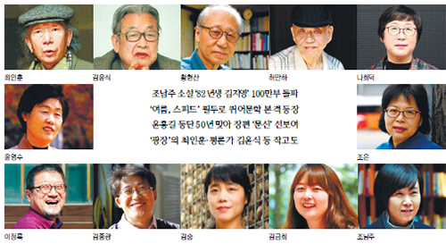 이런 가운데에서도 중진과 원로급 작가들의 출간은 꾸준히 이어졌다. ‘완장’ ‘장마’의 소설가 윤흥길이 등단 50주년을 맞아 20여년째 집필에 매달려온 장편 ‘문신’을 선보였다. 개성이 생생하게 살아 있는 인물들과 작가 특유의 풍성한 전라도 사투리 입말이 시종 질펀하게 판소리 사설처럼 깔려 있는 소설이다. 그는 기자들과 만나 한국문학의 ‘경박단소’(輕薄短小) 경향을 걱정했다. 대하소설도 단편도 장편도, 다양한 모양이나 분량으로 공존하는 게 가장 이상적인데 이즈음은 현재 독자들이 가볍고 짧은 쪽을 선호하는 흐름을 보이니까 출판사들도 작가들에게 그 취향을 요구한다는 것이다. 작금 한국문학 출판에 대한 날카롭고 적확한 지적이다. 소설가 김성동은 격변하는 조선조 말기의 이야기를 담은 대하 장편 ‘국수’ 전 6권을 27년 만에 완간했다. 소설가 한승원은 올해도 장편소설과 산문집을 내며 ‘살아 있는 한 쓰겠다’는 다짐을 실천했다.
