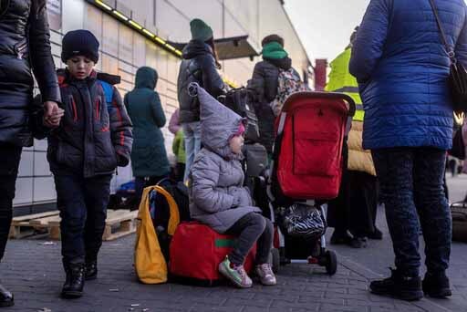 러시아의 우크라이나 침공으로 폴란드 프셰미실 난민 센터 앞에 우크라이나에서 넘어온 난민들이 모여 있다. 프셰미실=AFP연합뉴스