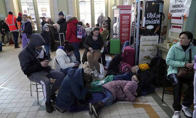 러시아의 우크라이나 침공으로 폴란드 프셰미실 기차역에서 우크라이나 난민들이 바닥에 누워 새우잠을 자고 있다. 프셰미실=AP연합뉴스