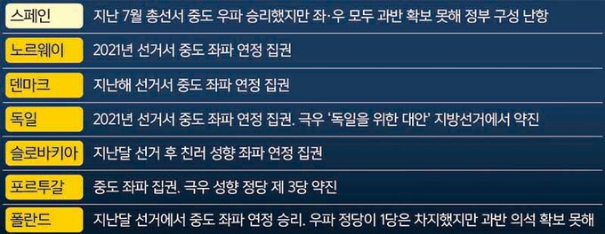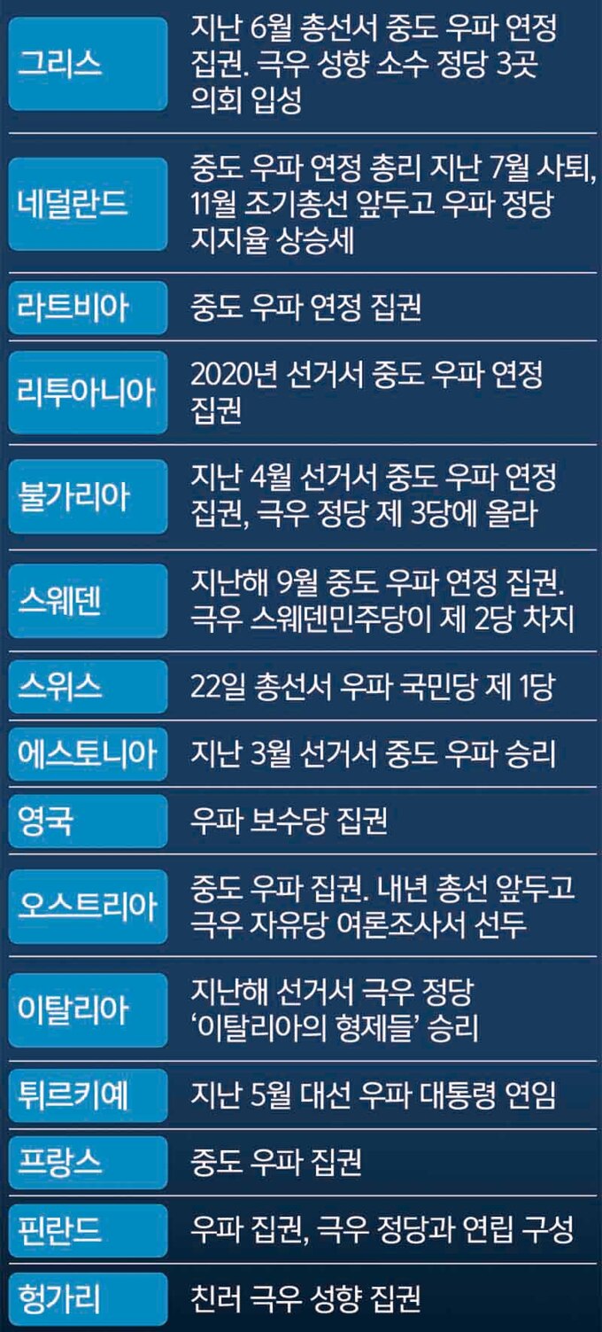 올 들어선 지난 4월 핀란드 총선에서 승리한 우파 국민연합당이 극우 핀란드인당을 포함한 3개 정당과 함께 새로운 연립 정부를 구성했다. 지난 6월 그리스 총선 때는 중도 우파인 현 집권당 압승과 함께 극우 성향의 소수 정당 3곳이 의회에 입성했다.