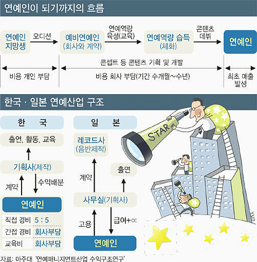 문화체육관광부는 최근 잇따르고 있는 연예인과 기획사 간 수익분쟁 실태를 파악하기 위해 아주대학교 산학협력단에 용역을 의뢰했다. 9일 아주대의 ‘연예매니지먼트산업 수익구조 연구’ 보고서에 따르면 씀씀이는 크지만 ‘한철’인 수익구조가 연예산업의 발전을 방해한다는 내용이 골자였다. 쉽게 말해 한 물 가기 전에 투자비를 뽑아내야 한다는 것이다.