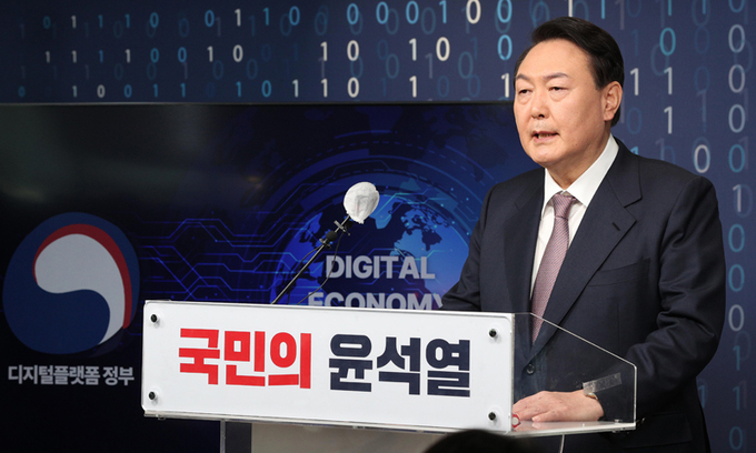 국민의힘 윤석열 대선 후보가 28일 서울 여의도 중앙당사에서 ‘디지털 지구 시대’ 대한민국 디지털 경제 비전발표를 하고 있다. 연합뉴스