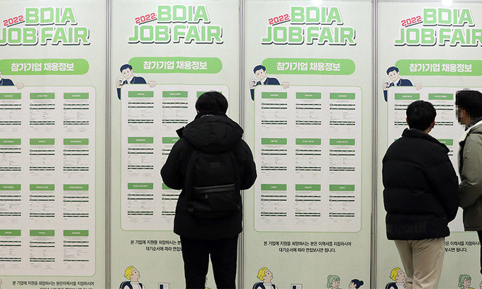 [부산=뉴시스] 하경민 기자 = 부산디지털혁신아카데미 잡페어 '다IT(있)다'가 열린 8일 부산 해운대구 벡스코 제2전시장을 찾은 구직자들이 채용정보 게시판을 살펴보고 있다. 9일까지 이틀간 열리는 이번 행사에는 채용계획이 있는 정보통신분야 기업 42곳이 참가했다. 2022.12.08. yulnetphoto@newsis.com
