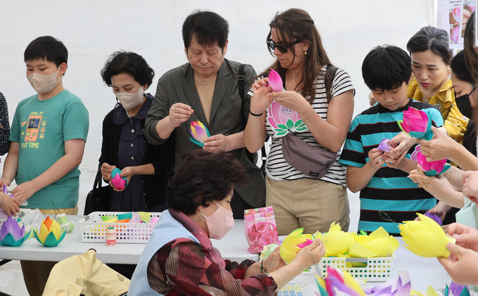 21일 서울 종로구 조계사 앞 우정국로에서 열린 불기 2567년 연등회 전통문화마당을 찾은 외국인 관광객과 시민들이 연꽃등을 만들고 있다.