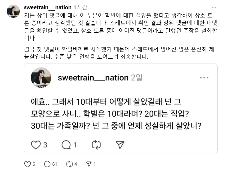 논란이 커지자 이 시의원은 7일 자신의 SNS에 글을 올려 “온전히 제 불찰”이라며 “수준 낮은 언행을 보여드려 죄송하다”고 사과했다.